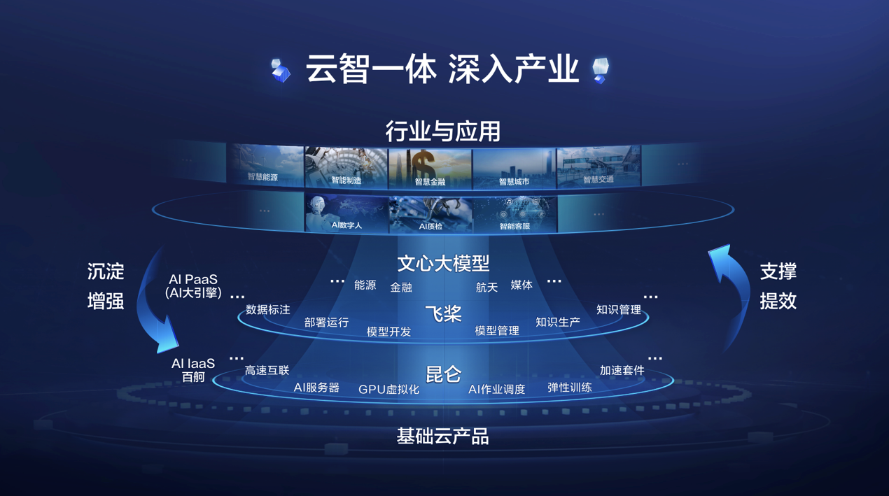 在云计算技术创新百花齐放的阶段,企业往往要自我搭配技术并耗费人力资源来实现智能升级,但是效果依旧不尽如人意,百度智能云AI大底座能够实现更好地循环迭代,让云智一体在深入产业的过程中,不同技术能力更加可控,进而让企业实现掌控业务的效果。