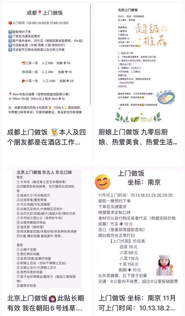 最近,社交平台上涌现出不少“上门做饭”的自荐帖,供应最多的是北京、上海、深圳,也覆盖成都、重庆、长沙、合肥等新一线和二线城市。
