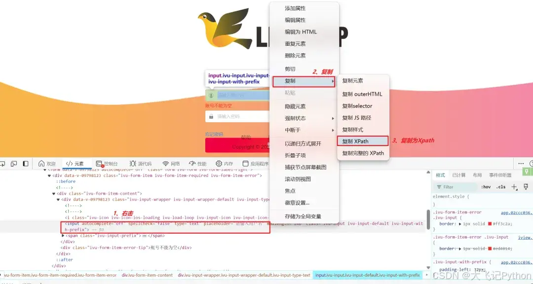 在新建的login.py中粘贴至对应位置(注:复制前端元素方式对应代码中By.XPATH还是By.CSS_SELECTOR的方式)