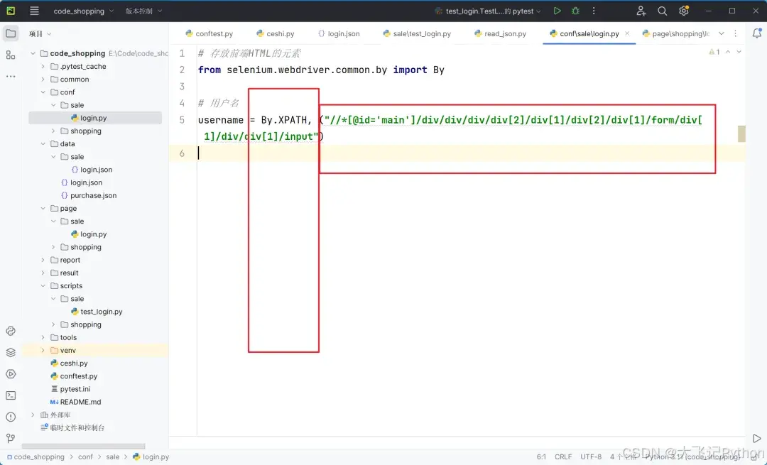 新建PageLogin类(继承Common类),在类中定义page_input_username方法,调用common_input输入账户名;login.username为我们刚刚写好的conf/safe/login.py中的页面元素