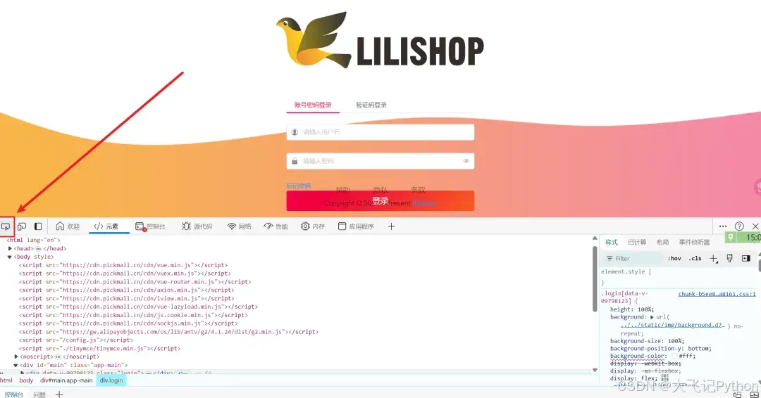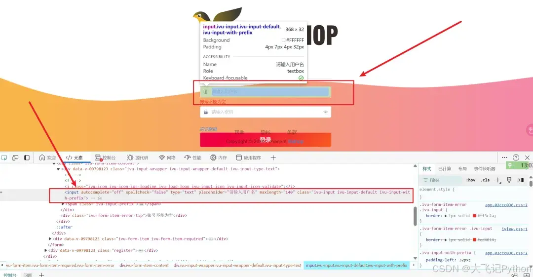 点击“元素选择器”,将鼠标移动至想要获取的元素上,比如“用户名输入框”