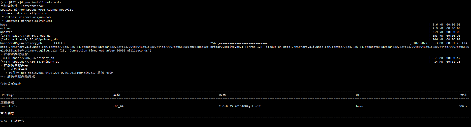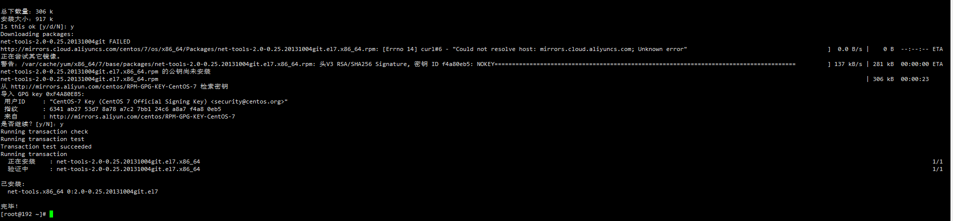 yum源更换成功后继续装net-tools,此时就能正常进行安装了