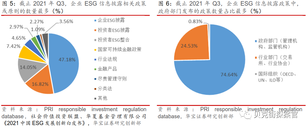 而对于ESG投资,ESG信息披露的重要性毋庸置疑,毕竟客观的信息披露,可以让企业外部人员,更清晰地知道相关企业是否做到了ESG相关事项,从而做出决策。根据PRI Regulation Database,截至2021年三季度,全球ESG政策中,关于企业ESG信披的政策数量达到481个,占比47.18%。