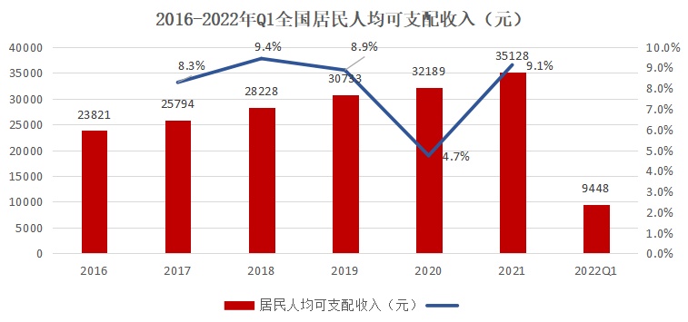从2016年以来,我国人均可支配收入持续增长,除了2020年受疫情影响,增长的步伐有所放缓,其他年份均保持8%以上的增速。