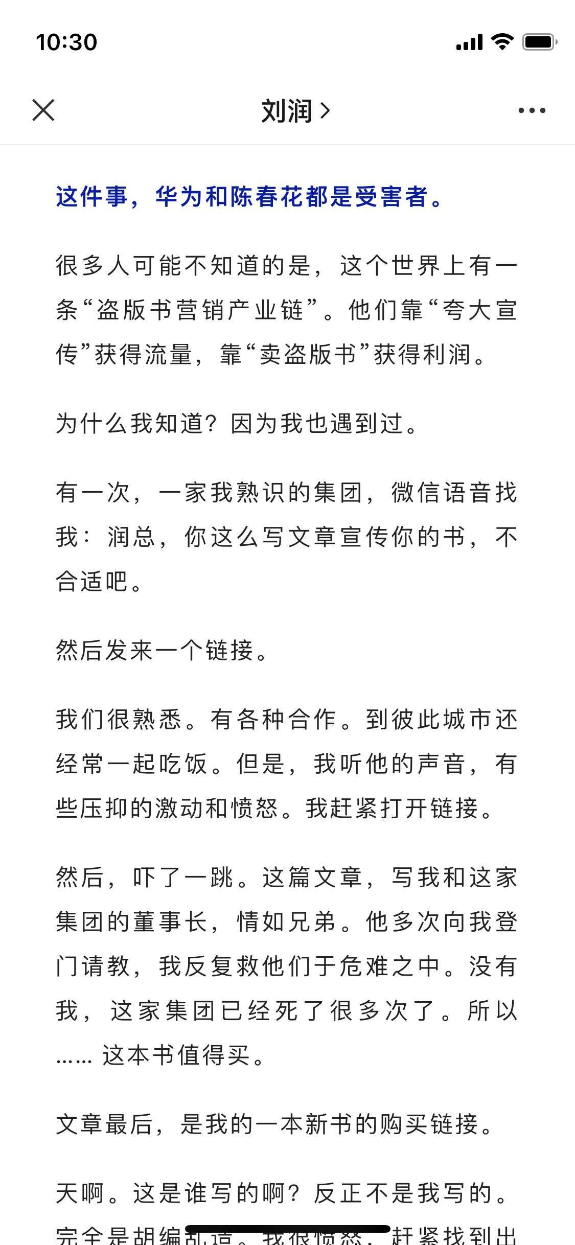 这文章当时就把他“吓了一跳”,因为对方集团对这种宣传书的方式“很不满”,后面证实是“盗版书营销产业链在作祟”。看看,这套路与陈春花和华为事件,是不是如出一辙。