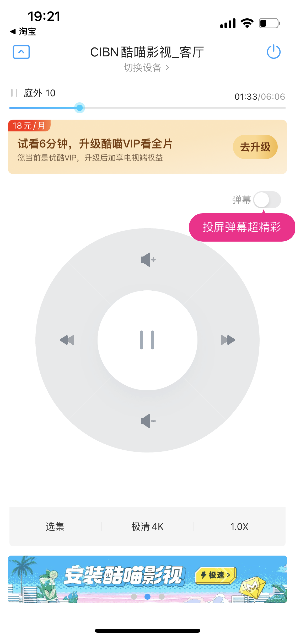 不过,网友反馈的情况又是真实发生的——在尝试将《庭外》等标注有“独播”标签的电视剧投屏到电视上时,手机App的控制界面出现了常规内容没有的升级酷喵VIP引导横幅。提示用户可试看6分钟当前节目,要想看全片需升级获得电视端权益,展示的会员价格为每月18元。