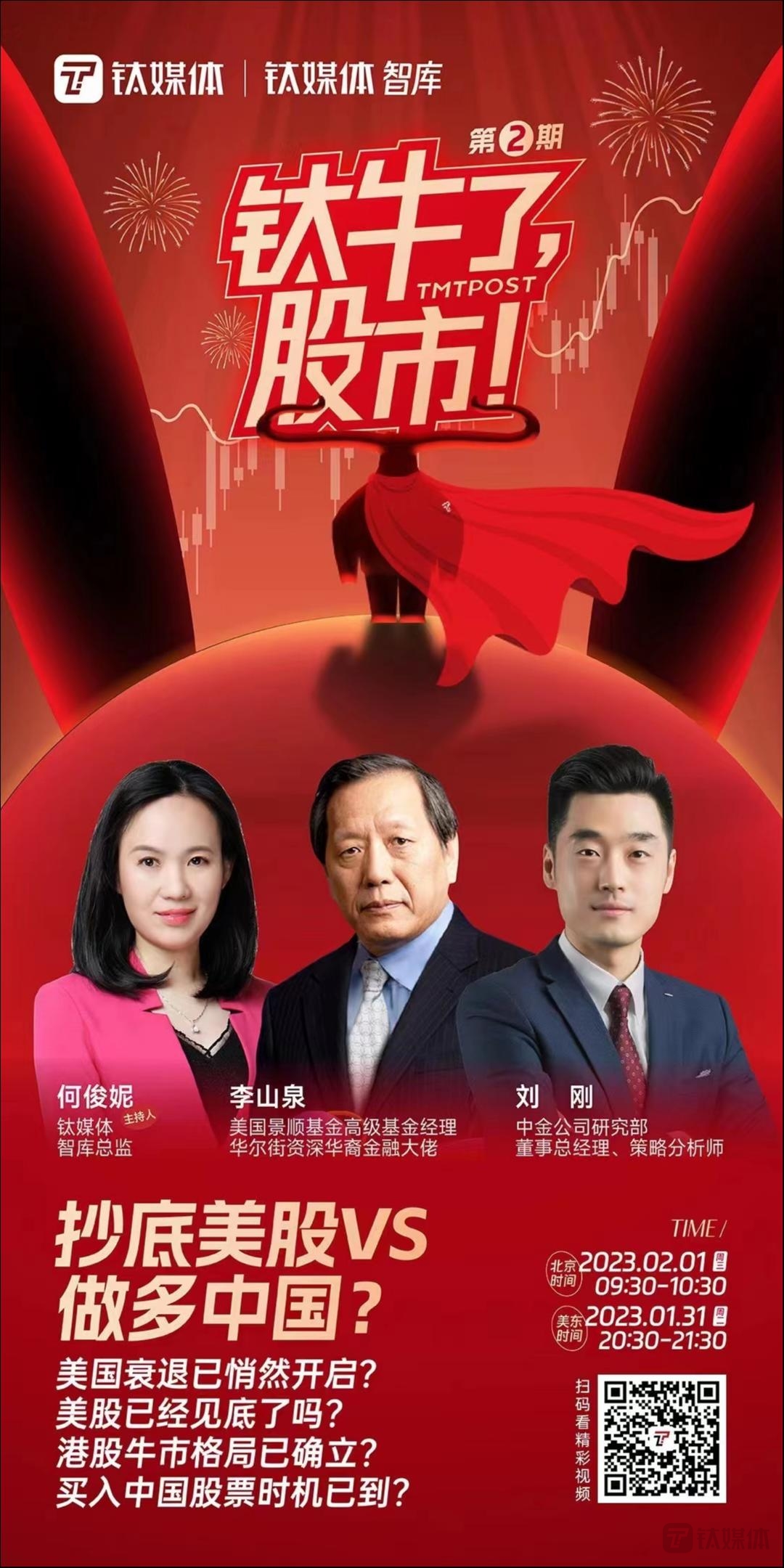明天(1月30日)A股将迎来兔年首个交易日,经历了通胀高企、美联储频繁加息的2022年,美国经济是否已开启衰退进程?美股此轮下跌是否底部已现?外资做多中国热情是否依然高涨?当下时点,投资者应该“抄底美股” 还是 “做多中国”?钛媒体app特别邀请两位重磅嘉宾—美国景顺基金高级基金经理、华尔街资深金融大佬李山泉与中金公司研究部董事总经理、策略分析师刘刚,为投资者深度分析上述热点关注话题。即刻扫二维码预约,一起交流,2月1日上午9:30-10:30(北京时间)、1月31日晚20:30-21:30(美东时间),《钛牛了,股市!》与你不见不散!