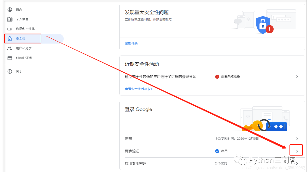 4、启用两步验证 【安全性 -> 两步验证】