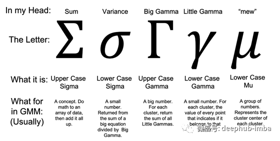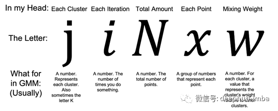 除此以外,我们也有一些英文字母在EM中代表GMM的意思。通常,英文字母围绕着希腊字母,就像小领航鱼围着大鲨鱼游动。就像小鱼一样,英文字母有一个重要的作用,它为如何解释算法提供了指导。
