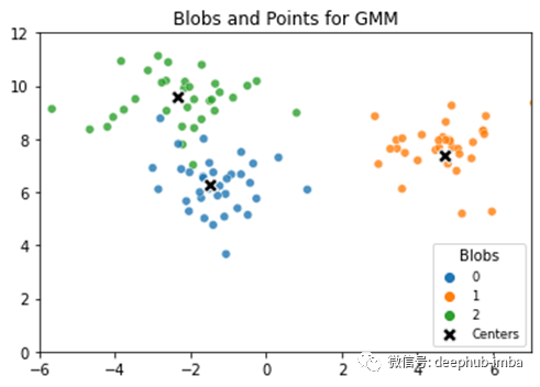 样本由图形上的点表示。这些点形成一些不同的斑点。每个斑点都有一个中心,每个点都与每个斑点的中心相距一定距离。给定GMM模型数据,目标通常是根据最接近的中心按其样本点标记其他样本。有些点距离一个或多个中心几乎相等,因此,我们希望基于某种概率来标记点。