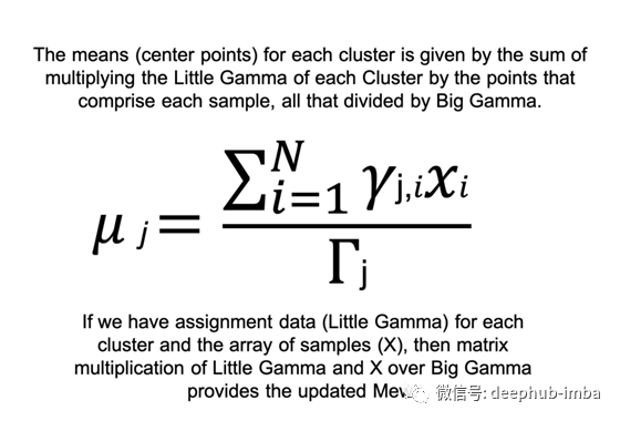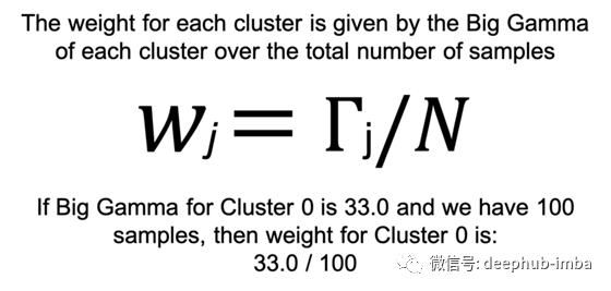 对于权重(𝓌),我们将“大写伽玛”除以特征总数。从更早的时候开始,我们就知道每个聚类j的大写伽玛只是将给定聚类的每个样本的分配值相加的结果(该数字之和不等于1)。如下图所示