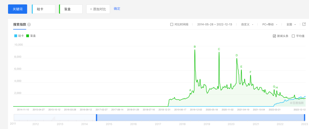 咕卡到底有多火?在百度指数,咕卡的搜索量自今年初就一路走高,至今仍在持续增长。它的搜索峰值甚至反复超过盲盒。与之形成鲜明对照的是,在微信指数,咕卡的热度又远远低于盲盒,两者根本不在一个数量级。