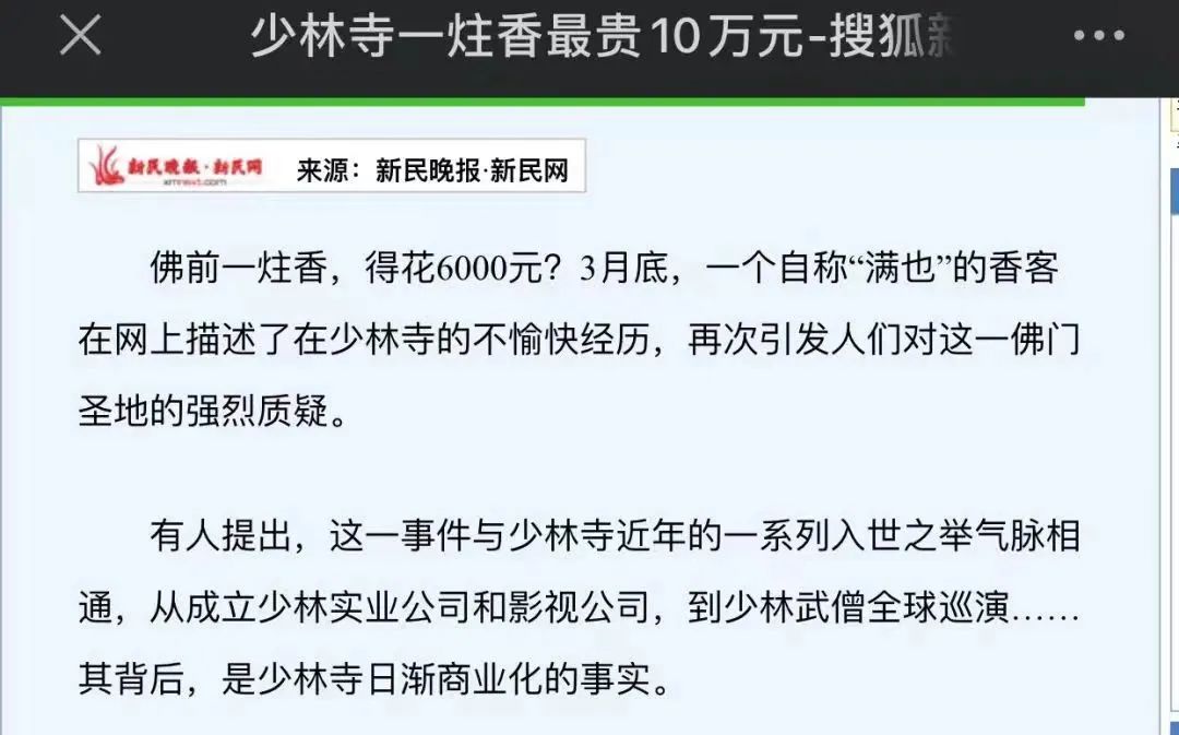 种种“离经叛道”的行为,让围绕在少林寺身上的争议与日俱增。早在2007年,新民晚报就报道称,在少林寺大雄宝殿台阶下有个“明码标价”的卖香处,最低400元一柱,最高价10万元一柱,大钱要赚,小钱也不放过。