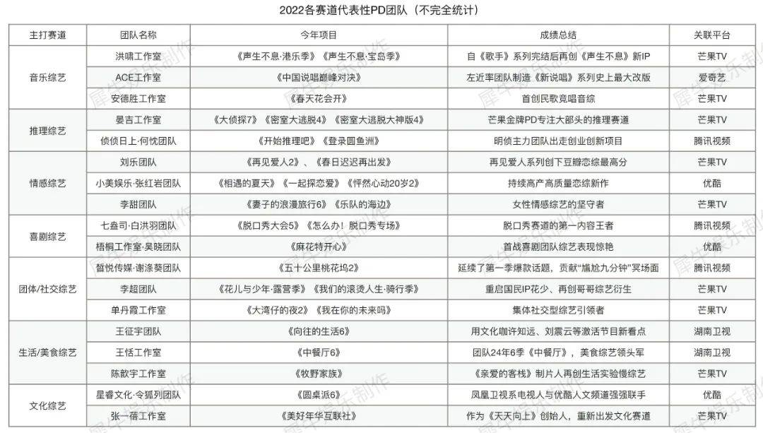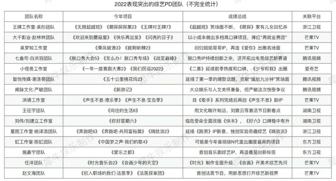 在梳理2022表现突出的综艺PD团队时,犀牛君明显发现,诸多在行业内外拥有广泛知名度的金牌PD,仍不负众望地在今年拿出了“有意思”的新综项目。