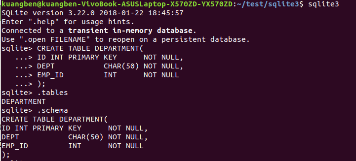 如上图所示,我们创建了COMPANY DEPARTMENT两个表。其中ID 作为主键,NOT NULL 的约束表示在表中创建纪录时这些字段不能为 NULL。