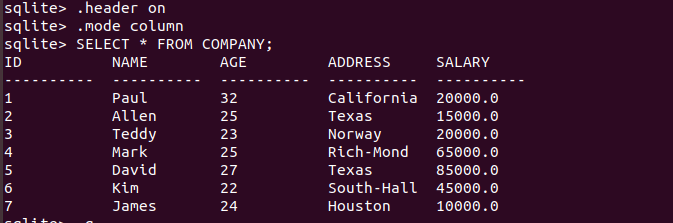 SELECT ID, NAME, SALARY FROM COMPANY; --只输出ID, NAME和SALARY三列
