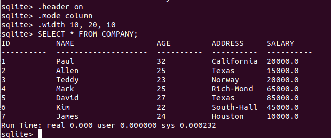 上面程序显示了如何从前面创建的 COMPANY 表中获取并显示记录,输出结果如下: