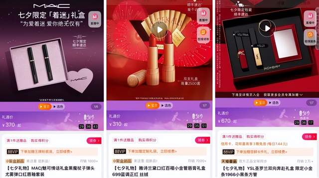 比如,MAC、阿玛尼、雅诗兰黛、YSL,今年七夕都推出了内含两到三支经典色号口红的限定礼盒,价格分别是370元、520元、620元和730元;NARS的口碑产品“腮红+唇釉”套装礼盒,售价520元;雅诗兰黛、兰蔻等品牌还推出了更实用的全明星护肤礼盒,售价也不到千元。