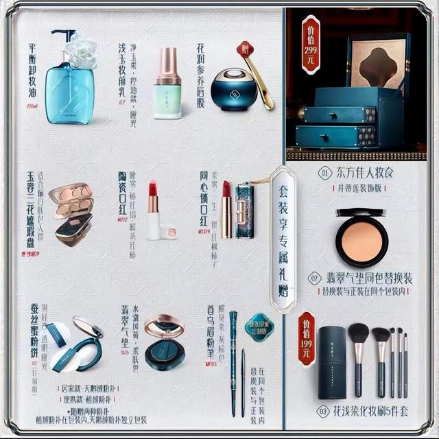 就拿今年七夕的花西子礼盒来说吧,价格从699元到1314元不等。最贵的1314元套装,包括卸妆油、妆前乳、气垫、蜜粉饼、遮瑕盘、口红、唇膜、眉笔、化妆刷和一个宣称价值299元的化妆盒。