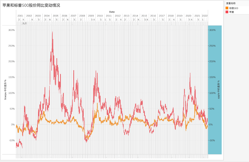 为客观评判苹果在资本市场中表现,我们计算其每日股价同比变动情况,并与标普500做对比,见下图