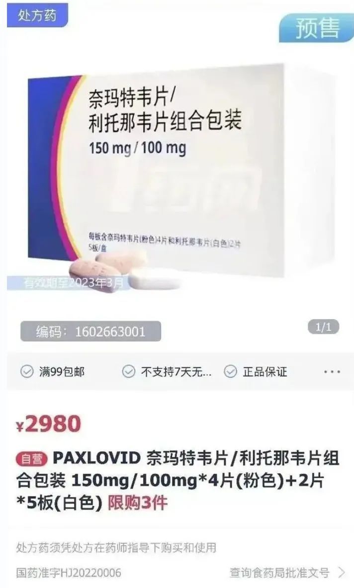 尽管Paxlovid的市场认可度不高,但在1药网一度被炒到2980元一盒的天价,比之前医保采购价2300元要高出一截。据悉,每盒Paxlovid包含20片奈玛特韦和10片利托那韦。以此计算,**每片Paxlovid的价格约为100元,是名副其实的“天价药”**。但不知何种原因,目前1药网相关预售页面已经删除了。