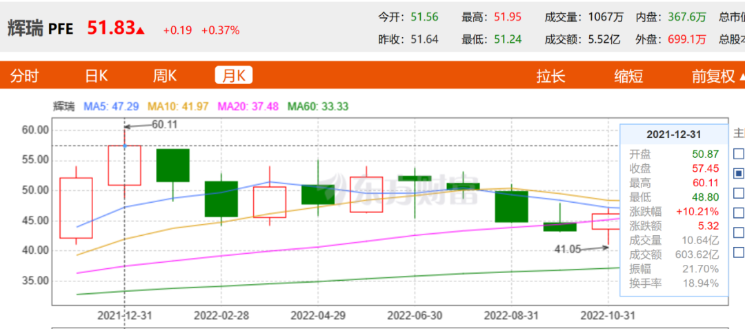 辉瑞也成功撬动了资本市场,从最新股价来看,51.83美元/股的股价处于历史高位,虽然相比最高点61.71美元/股有所下滑,却依然拥有2909亿美元的总市值,成为全球医药行业的翘楚。