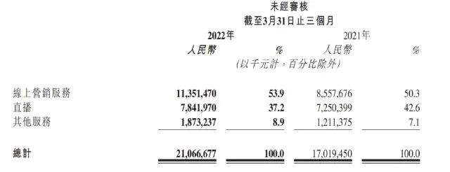 从收入结构看,快手2022年第一季度,线上营销服务、直播和其他服务(含电商)对营收的贡献占比分别为53.9%、37.2%和8.9% 。