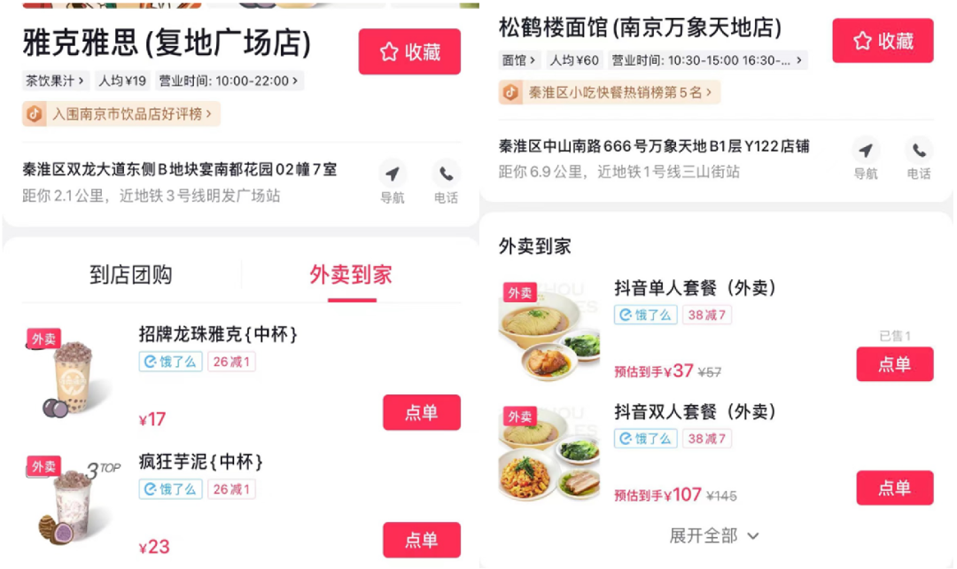 除此以外,在商家与用户共同关注的配送时效上,以南京地区为例,财经无忌选取同一家南京门店,分平台同时下单体验发现,配送时长在30分钟到1小时。而在实际配送上,依托“蓝骑士”的饿了么提前到达,整体来看,在抖音下单与通过外卖软件下单差别不大。
