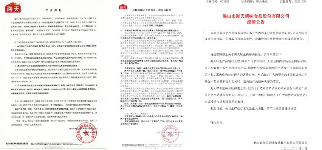 在前两次的回应中,海天味业强调,食品添加剂广泛应用于各国的食品制造中,公司的产品在食品添加剂的使用上严格遵循各国标准,且这些标准没有高低优劣之分,这次事件是一些网络博主为了博眼球,故意妖魔化食品添加剂并给品牌泼脏水。
