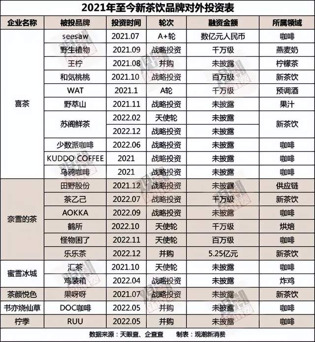奈雪紧随其后,今年3月,成立一家投资公司——美好自有力量。此外,日前,奈雪的茶还联合消费、科技领域知名投资人发起设立初芽创投基金公司,主要投资领域为大消费和泛消费创新科技赛道。