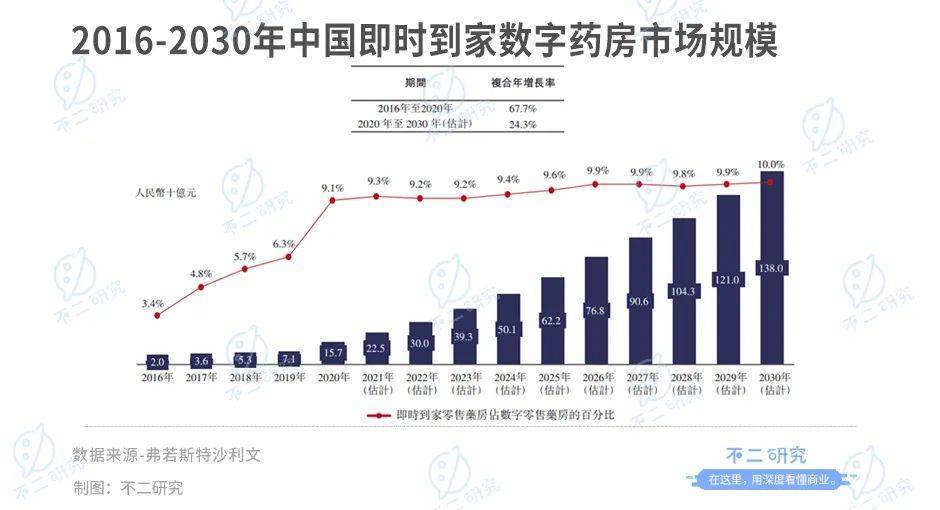 据弗若斯特沙利文报告,2016年至2020年,即时到家数字药房市场以67.7%的复合年增长率自2016年的20亿元开始大幅增长,预计2030年将达到1380亿元,复合年增长率为24.3%。此外,预计数字零售药房市场上的即时到家数字药房的占比将从2020年的9.15%增加至2030年 的10.0%。