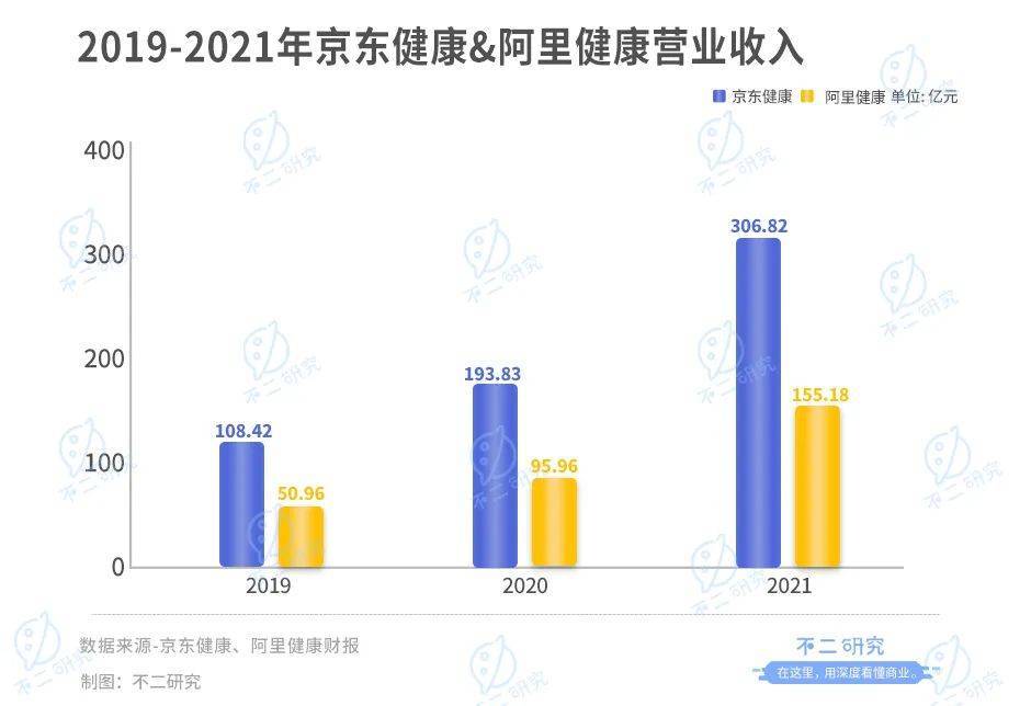 据此前京东健康财报显示,2019-2021年,其收入分别为108.42亿元、193.83亿元和306.82亿元。同期,阿里健康财报显示,其收入分别为50.96亿元、95.96亿元和155.18亿元。