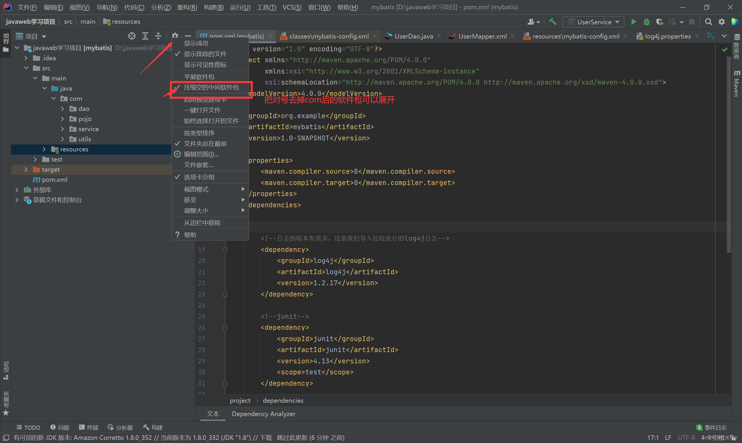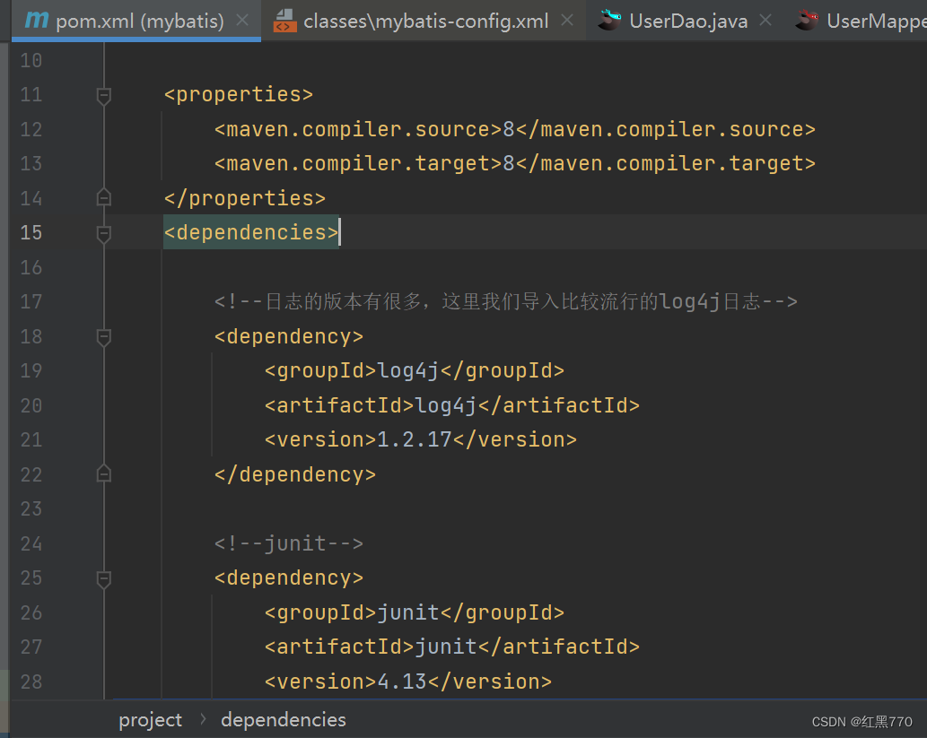 (在这里我用到的是log4j日志在pom.xml下添加jar包如图)