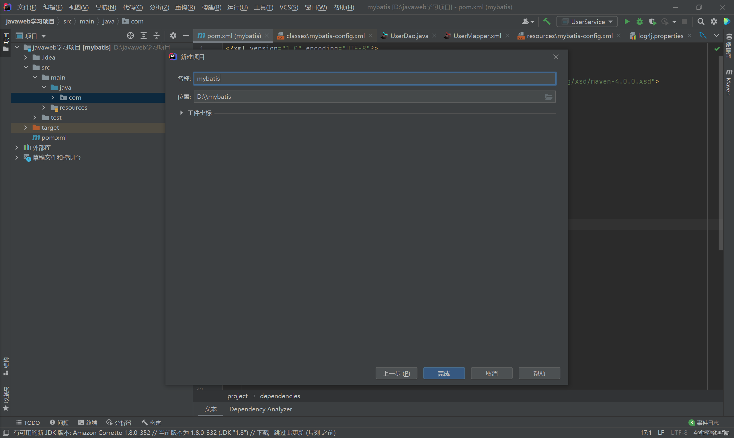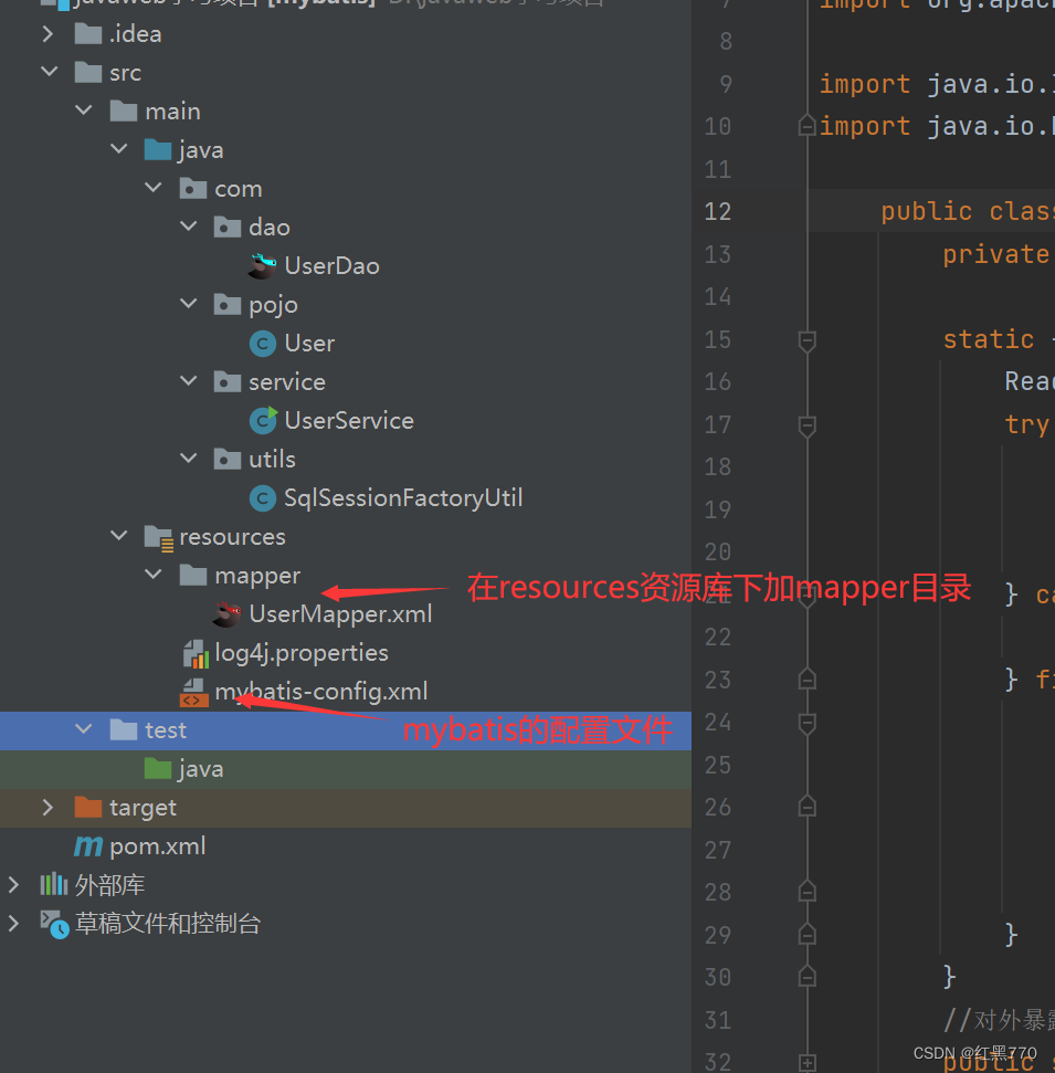 在resource下新建mapper目录,新建mybatis的配置文件如下图所示