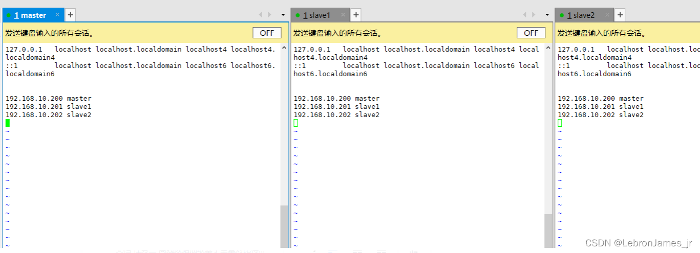 准备三台虚拟机,关闭防火墙,修改他们的主机名,第一台虚拟机为master 剩下两台分别是slave1和slave2,修改hosts文件 修改他们的主机映射,三台进行免密操作。
