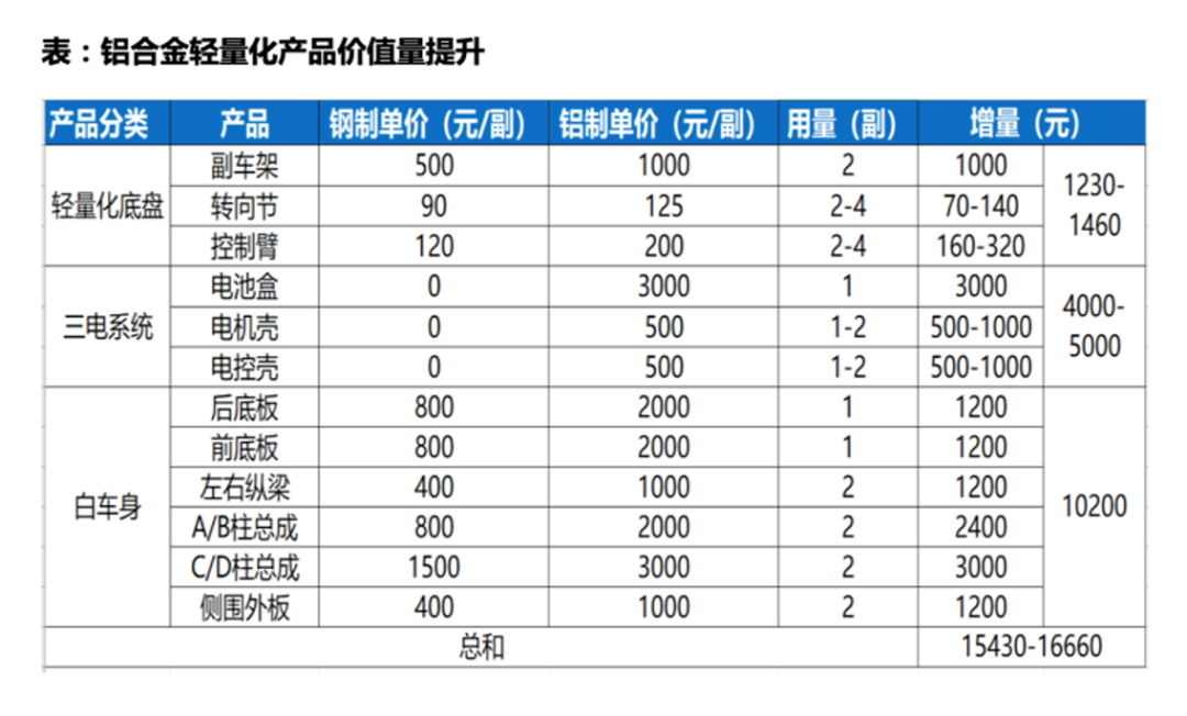 但如果说未来铝合金结构件渗透有望从底盘+三电提升到整个白车身的话,则单车提升价值约在16000元。