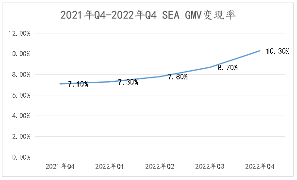 GMV下降,电商收入却仍在增长。得益于SEA大幅提升了电商变现率。四季度,SEA电商变现率同比增加了3.2个百分点达到10.3%。换言之,Shope一年几乎增加了一个拼多多的变现率。