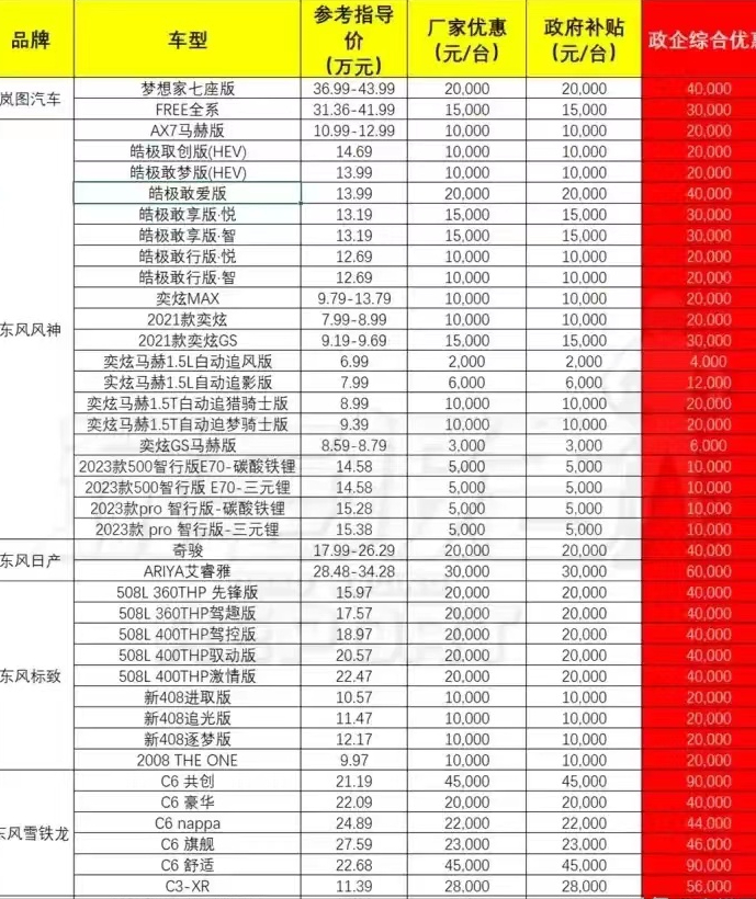 湖北这波政企补贴,让车市的关注点也一并转移到了湖北,湖北这次购车活动主要有东风风神、东风标致、东风雪铁龙、东风本田、东风日产等品牌,所涉产品涵盖皓极、标致408、雪铁龙C6、本田CR-V等上品牌对应的主力车型,优惠金额从5000至90000元不等。