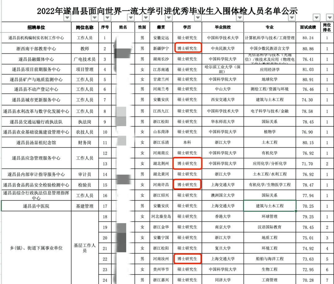 更为具体的案例是,在今年5月,位于浙江省丽水市遂昌县的24个基层工作岗位吸引来了博士4人,硕士19人和本科1人。其中不乏中科大、浙大、复旦、同济、上海交大等名校毕业生。