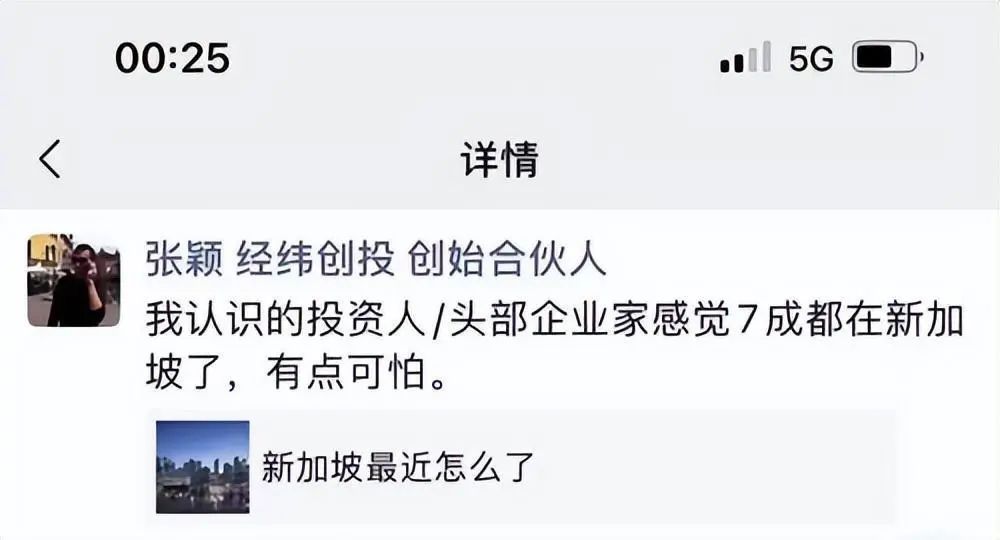新加坡的走红也是一场自上而下的迁徙运动,最先闻风而动的投资机构和富豪们,国内知名投资人张颖前不久甚至在朋友圈表示:**“我认识的投资人/头部企业家感觉7成都在新加坡了,有点可怕…”**