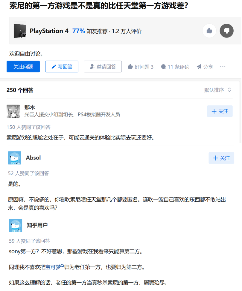 在知乎上有一个“索尼的第一方游戏是不是真的比任天堂差”的问题,汇聚了超过200个回答。点赞数排名前列的帖子中,答主们不约而同地给出了肯定答案。