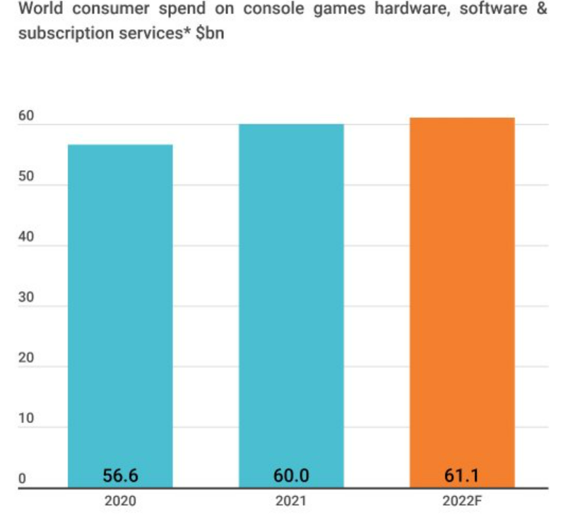 根据市场机构Ampere的报告,全球主机游戏市场在2021年迎来复苏,全年的消费者支出、软硬件销售额均超出预期。虽然2022年的销售数据尚未更新,但Ampere预计全年主机游戏支出总额将超过610亿美元,较2021年进一步增长。