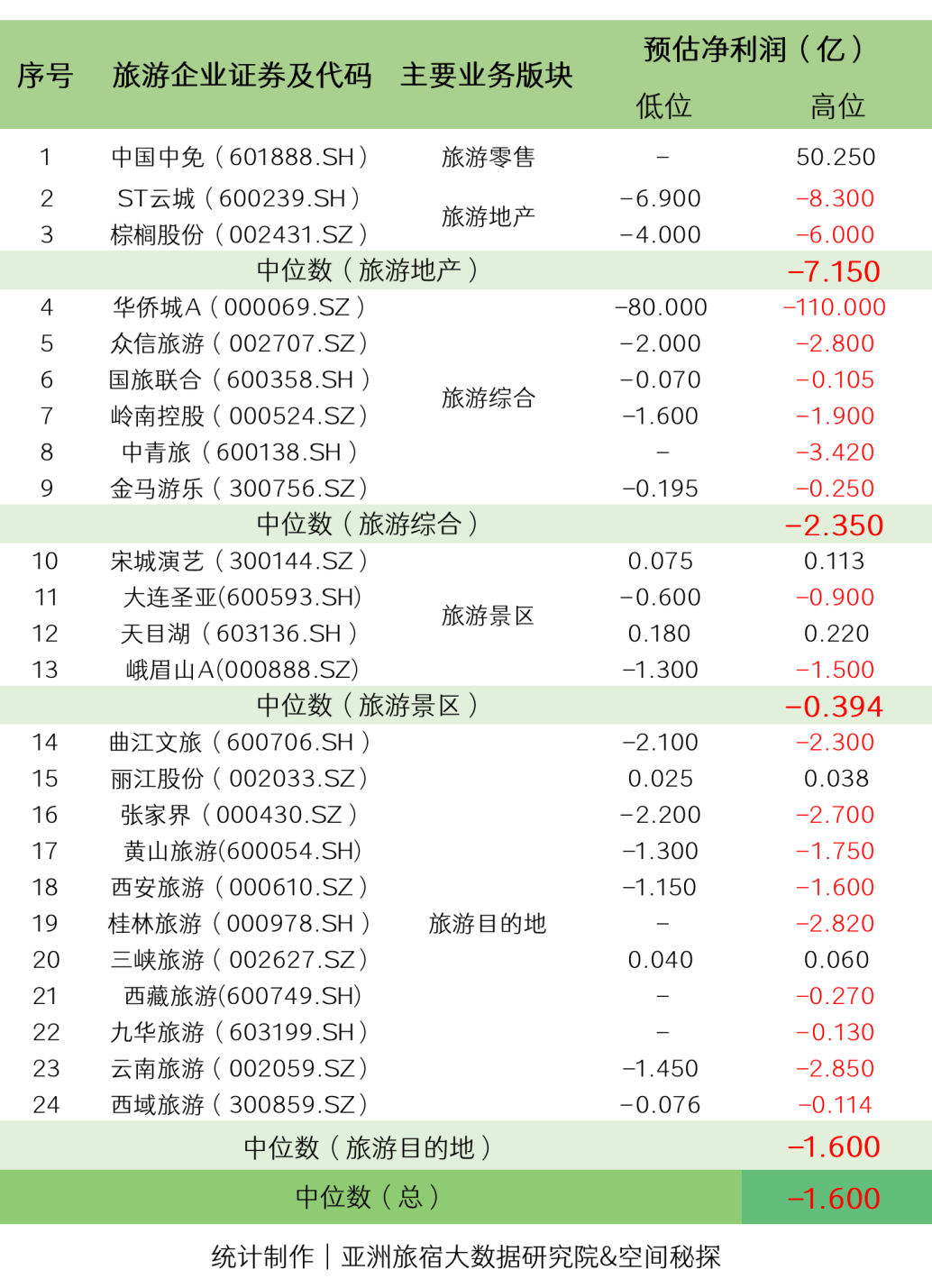 亚洲旅宿大数据研究院监测的24家上市旅游企业中,仅5家旅游企业预估净利润为正值,19家旅游企业都预估出现不同程度的亏损。总体亏损中位数在1.6亿元人民币左右。