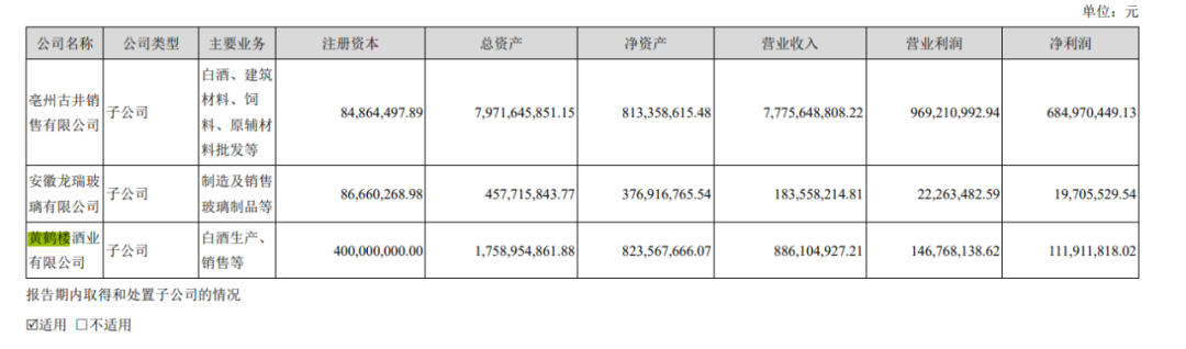 公开资料显示,黄鹤楼酒业成立于2003年,注册资本4亿元。而黄鹤楼酒是湖北省唯一的中国名酒,目前拥有武汉、咸宁、随州三大基地,2016年4月27日被古井贡酒溢价超过3倍收购51%股权。