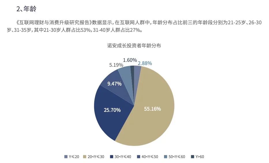 《互联网理财与消费升级研究报告》数据显示,在互联网人群中,年龄分布占比前三的年龄段分别为21-25岁、26-30岁、31-35岁,其中21-30岁人群占比53%,31-40岁人群占比27%。