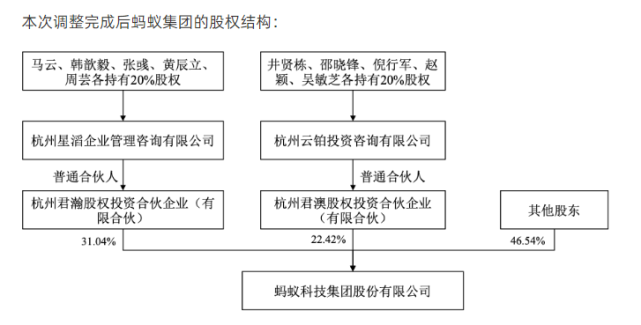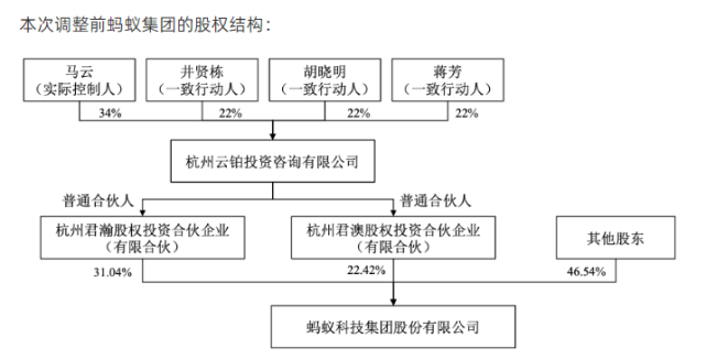 据蚂蚁集团发布的关于持续完善公司治理的公告显示,本次股权调整前,马云作为实际控制人,与井贤栋、胡晓明、蒋芳构成的一致行动人,共同通过杭州云铂投资控制杭州君瀚以及杭州君澳两家企业,这两家企业合并持有蚂蚁集团53.46%的股份。