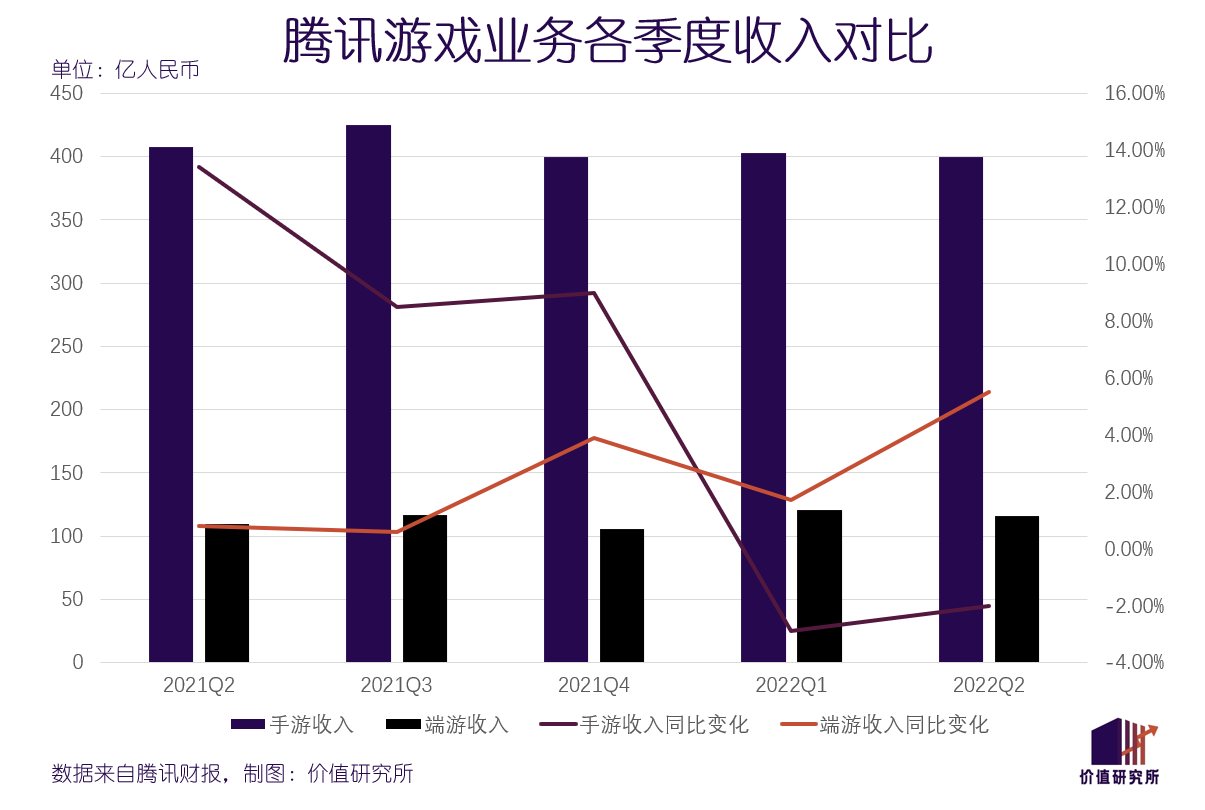 其中,最重要的手游收入为400亿元,同比下滑2%——这不仅是腾讯手游业务近6个季度的最差表现,也是继2020年四季度之后首次出现连续两个季度负增长。