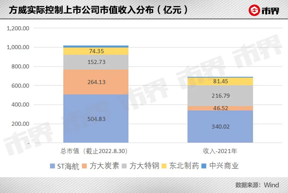 截至当前,方威实际控制的A股上市公司有5家,分别是ST海航、方大碳素、方大特钢、东北制药和中兴商业,合计市值达到1017亿元,其中505亿元的海航占了接近一半。