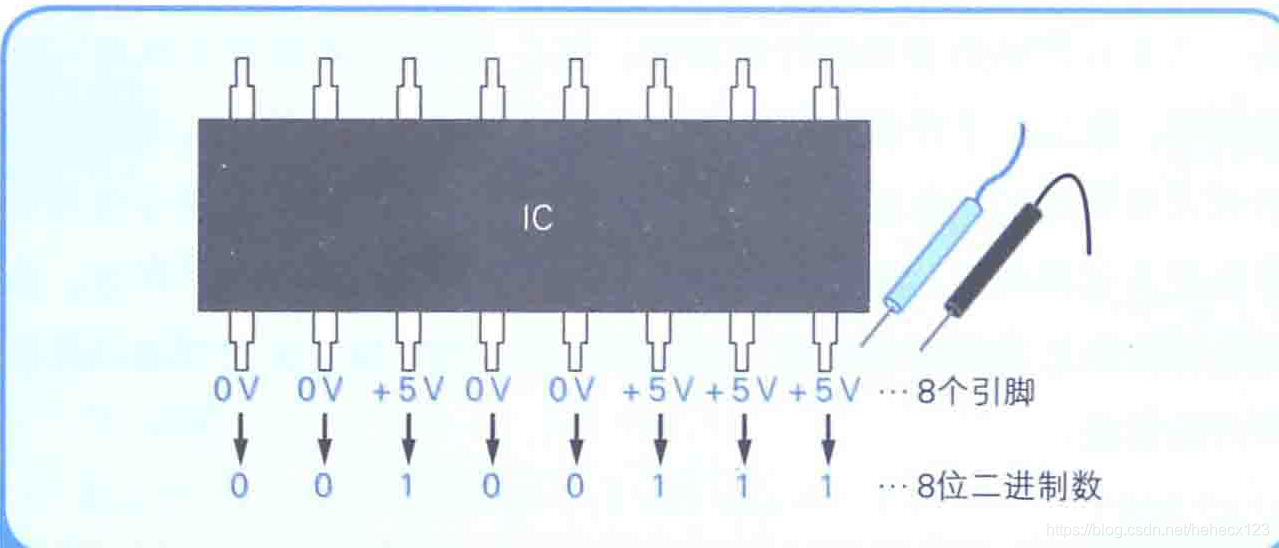 计算机内部都是由IC(集成电路)这种电子部件组成的,如下图所示,为典型IC的形状,在其两侧有大量的引脚,IC所有的引脚只有直流电压0V和5V两种状态。IC的这种特性决定了计算机的信息数据只能用二进制数来处理。二进制的位数一般都是8位、16位和32位,即8的倍数。8位二进制数被称为一个字节,字节是最基本的信息计量单位。位是最小单位,字节是基本单位。