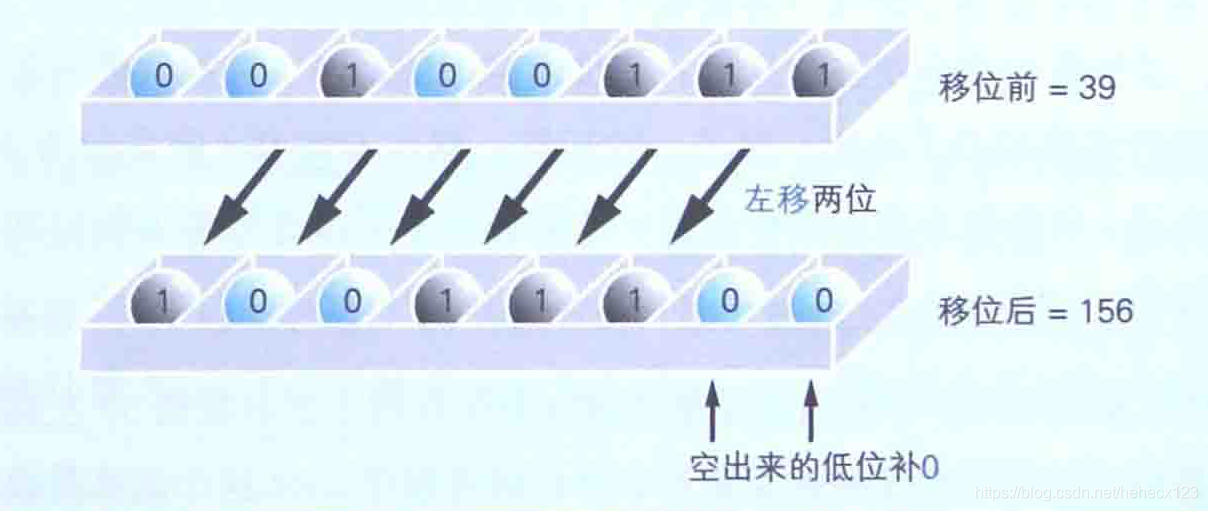 二进制运算与十进制运算一样,也同样适用于四则运算,二进制的加减运算和十进制比较类似,十进制是逢十进一,而二进制则是逢二进一。但是二进制的乘除运算则是通过移位来实现的,二进制中的移位运算是把所有位数向左移或者右移,<<和>>分别代表左移或者右移运算符,如下图所示为将39所表示的二进制进行左移两位的操作,可以看出二进制数值变为原来的4倍,空出来的低位补0,这就是二进制的乘法,相对应的除法就是右移操作了。注意,不论程序代码中移位操作的几进制数,最后到计算机中都会转换为二进制进行操作。